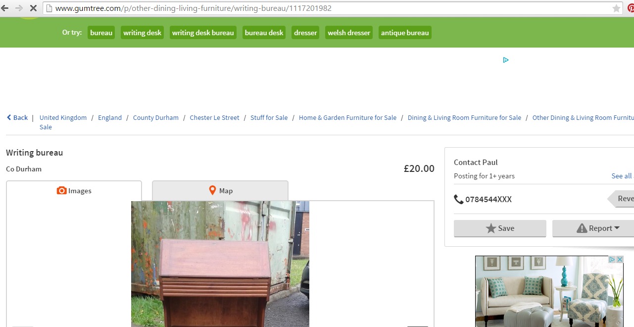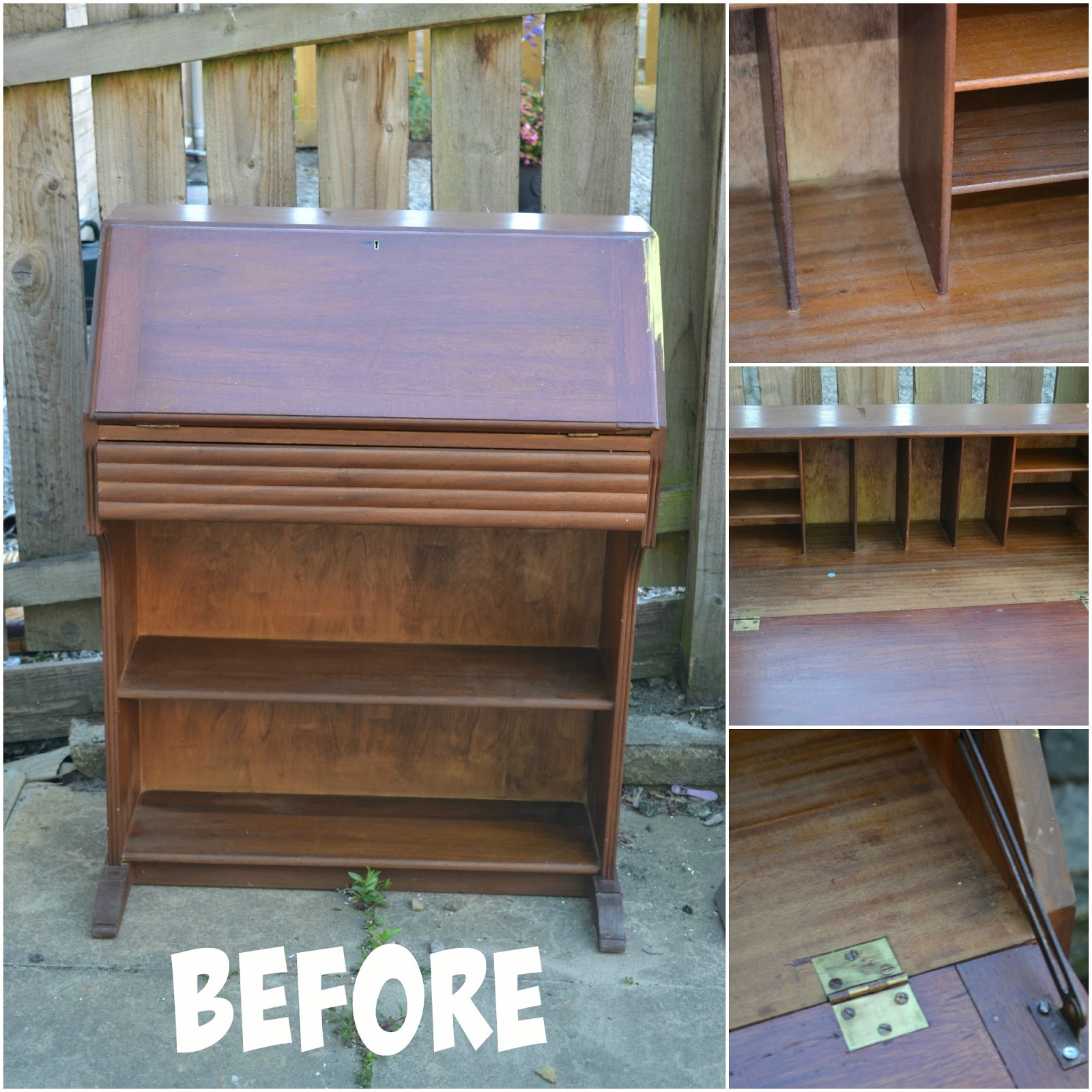 The item I found was a solid wood written bureau up for sale at £20. There was little detail in the advert so I took a chance. The bureau was solid and seemed quite old but came and a strong smell of smoke and some resident spiders.