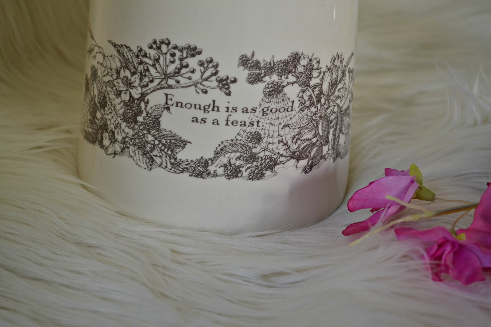 I was kindly sent two products from their range, the first one being the Enough is as good as a feast jug which features a beautiful hedgerow scene of blackberries, elderberries and rose hips.