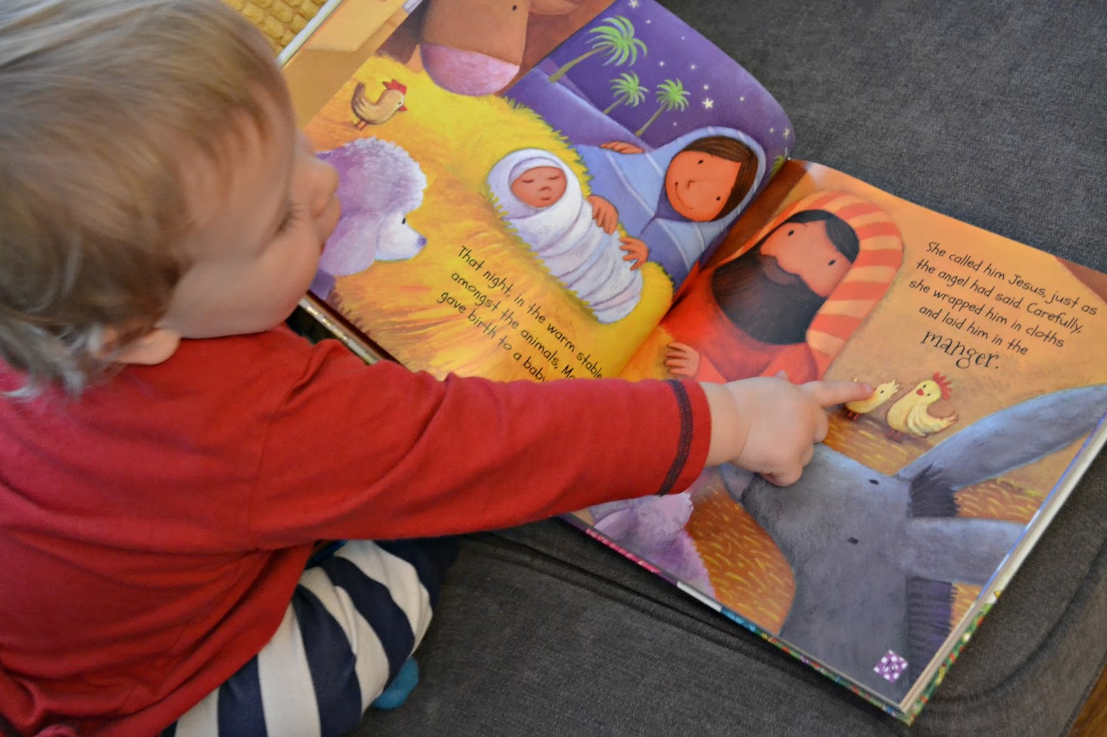 The little man seems pretty impressed and likes to point out the animals and make the noises to go with them. I love how clear and bright the picture’s are. The art work is perfect for a traditional children’s book, with each story drawn by a different artist.
